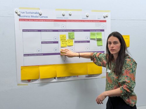 Mit Hilfe vom Business Model Canvas (BMC) werden gemeinsam Ideen geschärft, kritisch hinterfragt und konkretisiert. Laut Moritz Kistenmacher von der Startup Academy Baselland, handelt es sich beim BMC um «einen leanen (schlanken) und strukturierten Startup-Ansatz, bei dem man einfach, effizient und in kleinen Schritten vorwärtsgehen kann. Ihr durchlauft einen Kreislauf, bis ihr das Geschäftsmodell für ein Produkt oder eine Dienstleistung beieinander habt.» In drei Gruppen unterteilt, definieren die Teilnehmenden am Workshop Wertangebote, Kundensegmente, Vertriebskanäle, Ziele u.a.m. und verwenden zur Visualisierung verschieden farbige Post-Its.